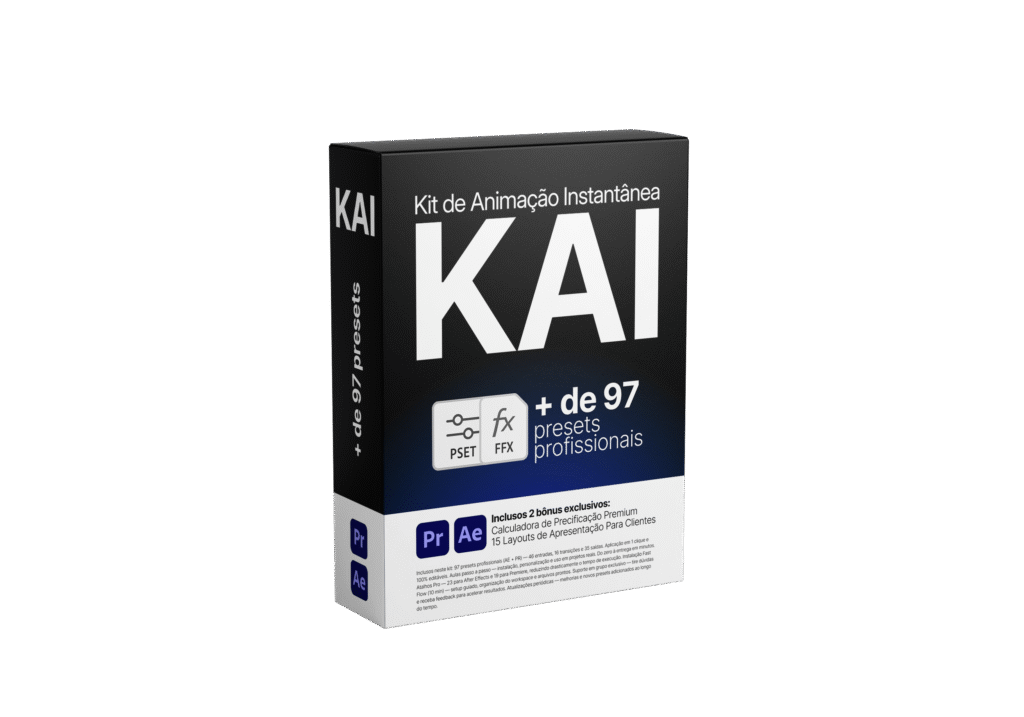 Acesso imediato na Área de Membros Premium + e-mail com o link (assunto: “Seu acesso ao KAI”). Entre, baixe os 97 presets (AE + PR) e assista à aula passo a passo.